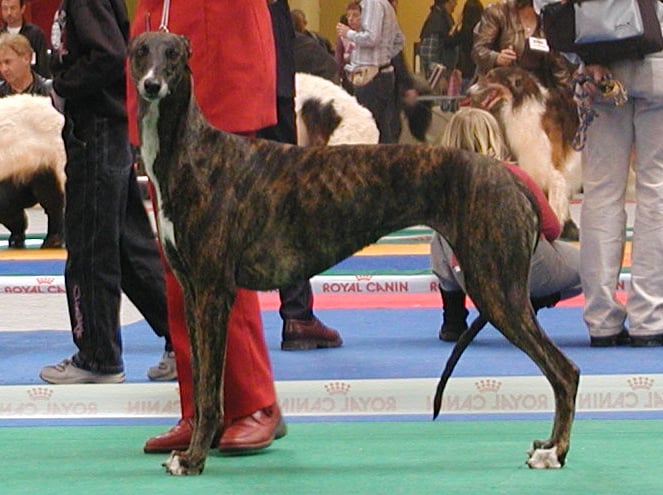 Bringé foncé . Excellente pigmentation . Oeil moyen un peu rond . DCC très féminine . Exc pigmentation . Très jolie sortie d'encolure . Poitrine haute . Se porte un peu en avant . Belle angulation . se déplace facilement . Bonne poussée des postérieurs . Excellente présentation